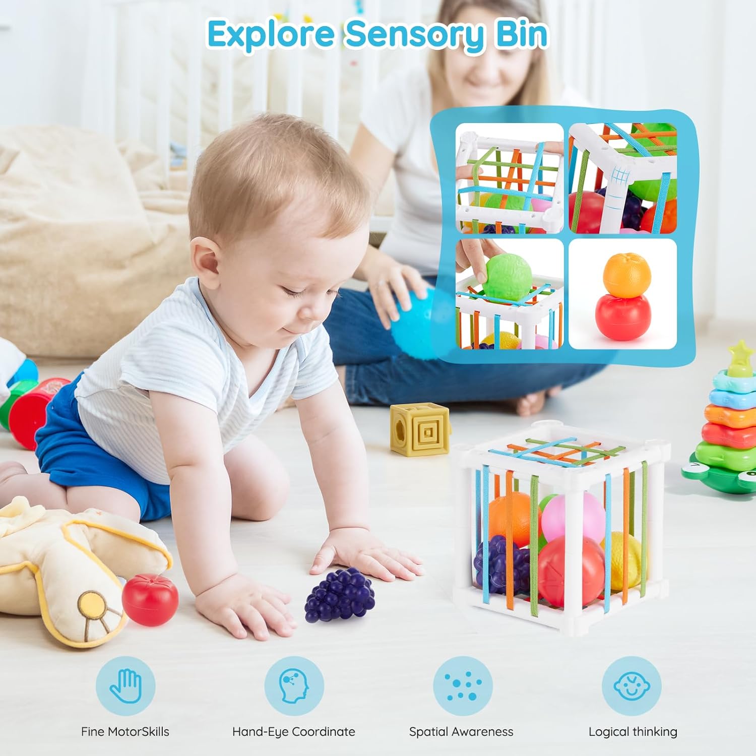 SHAPE SORTER SENSORY BIN – This sensory toy includes a cube with a colorful elastic band and 6 blocks in different colors and fruit shapes. Babies can train their grip by putting blocks in and out of the cube, enhancing their spatial sense, awakening their curiosity and helping them experiment.