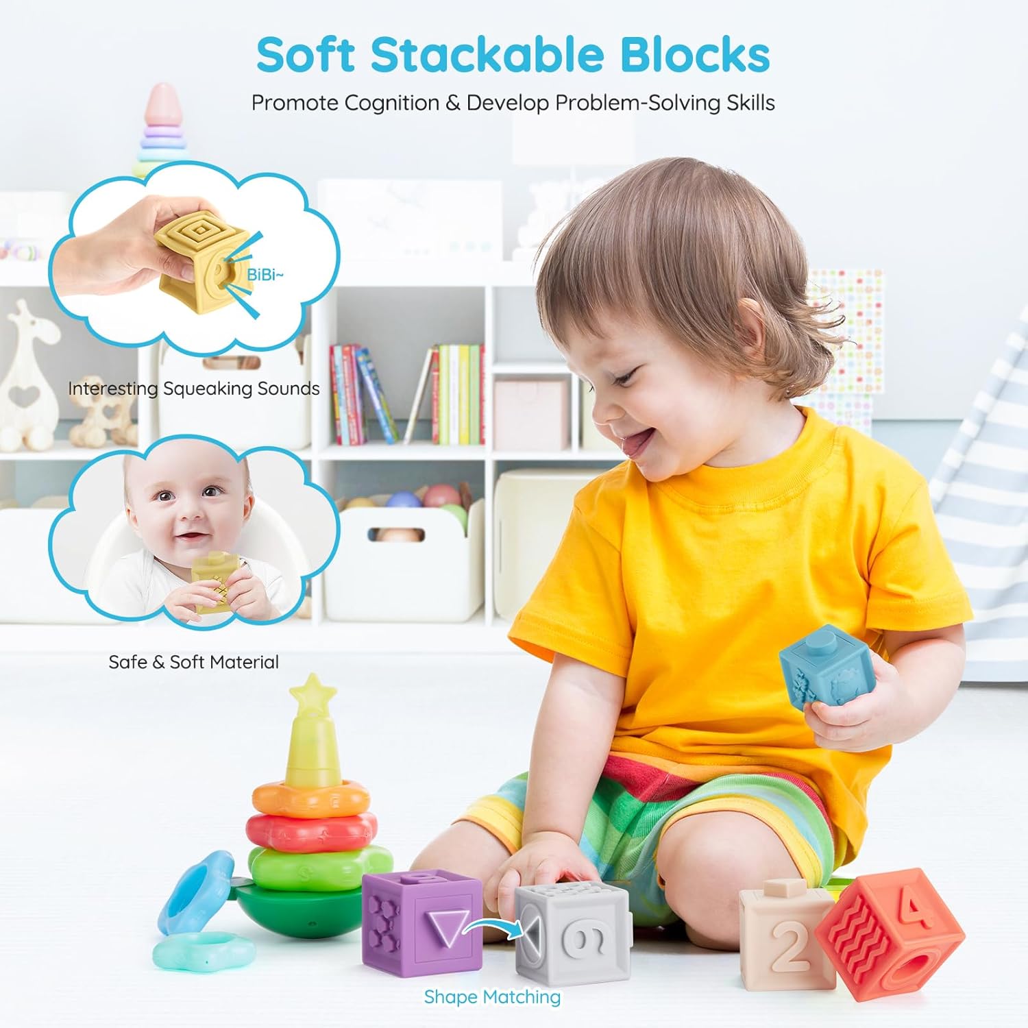BUILDING BLOCKS STACKING RINGS – Infant blocks are embossed with animals, shapes, fruits, Arabic numbers and symbols on each side, providing a multi-sensory experience for your child.Similarly, our stacking rings set includes 5 rings in various sizes and colors, each engraved with numbers, letters, and adorable textures that your little one can safely chew on. By touching and observing these patterns, your baby can develop their sense of touch and vision. Invest in these toys to support your child’s cognitive development.