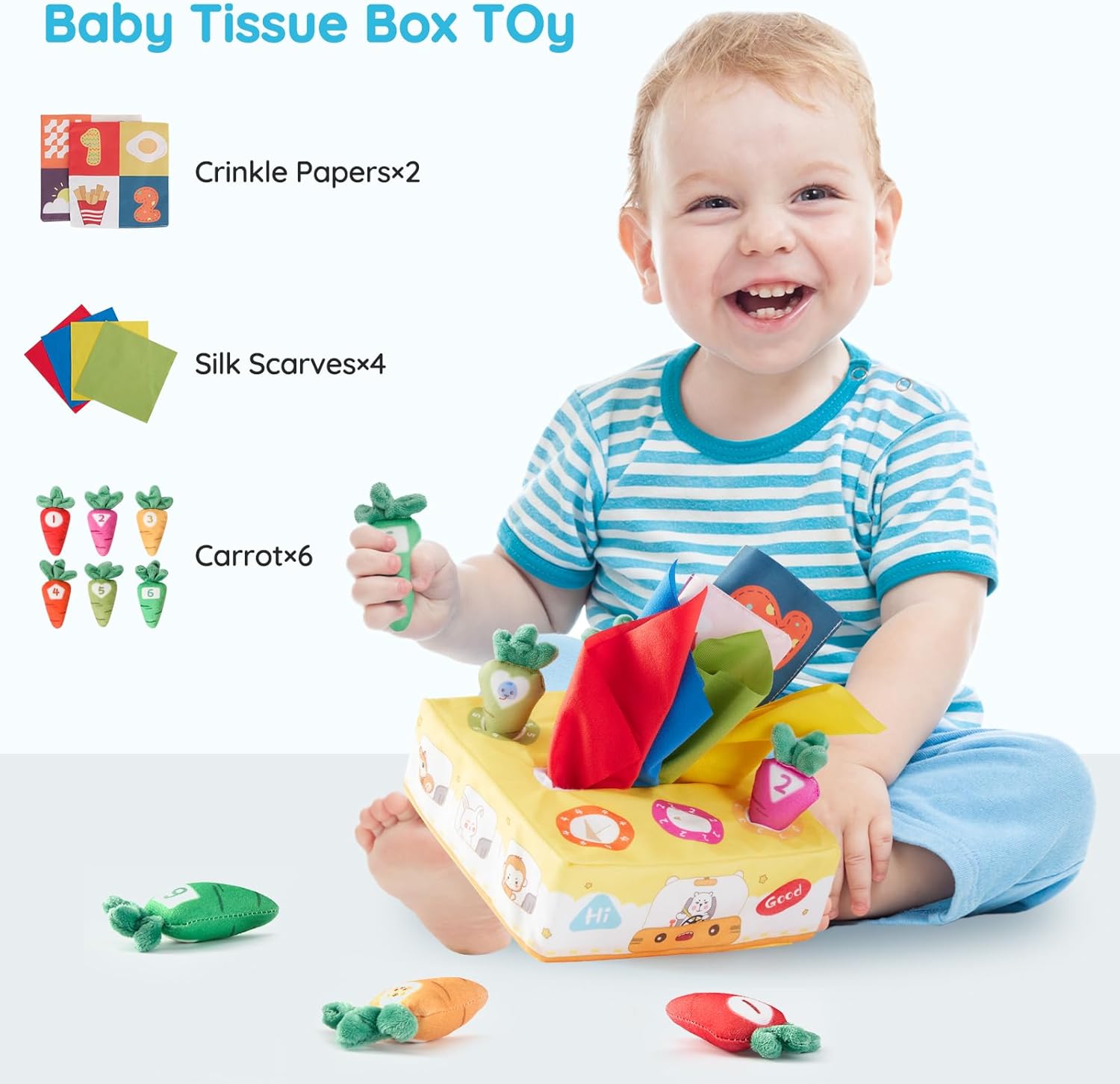 BABY TISSUE BOX – Babies love to play with tissue boxes and paper, so we’ve designed a safe and fun replacement. With our early development toys (2 packs of crinkle paper + 6 carrots + 4 packs of Soft saliva towel) ready for your baby, this sensory tissue box will provide hours of fun with its bright colors, crinkle sounds, and tugs and pulls.