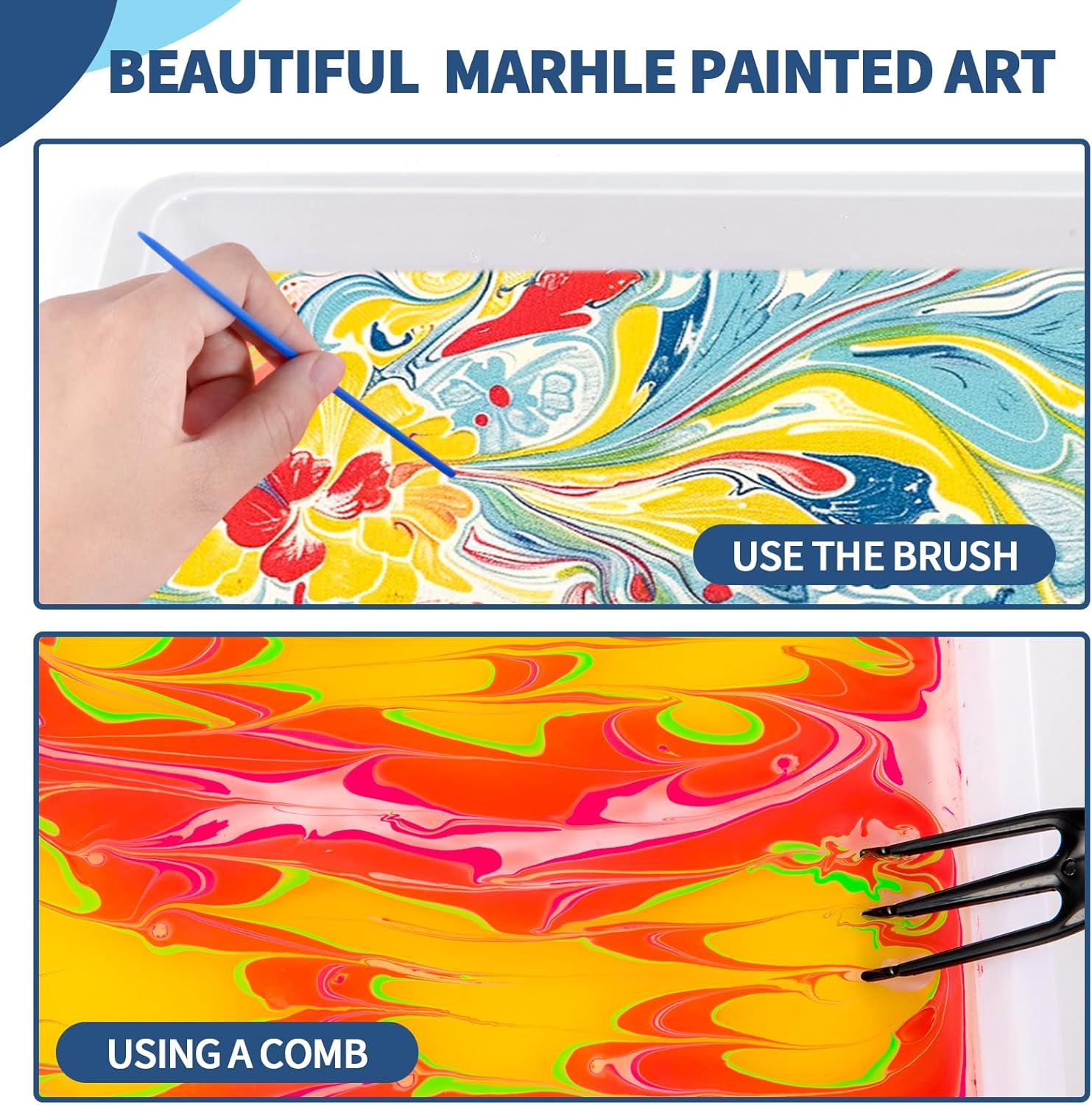 【Excellent Arts & Crafts Kits】Our water marbling paint crafts kits include 6 colors of paint, 10 sheets of paper, 2 drawing needles, 2 pipettes, a pair of tweezers, a drawing comb, a measuring spoon, 6 white shells, a display box, a tray, and an instruction sheet. With ample arts and crafts supplies, there are endless creative opportunities. The water marbling paint set is suitable for kids of all ages and adults, eliminating the need for a painting foundation.