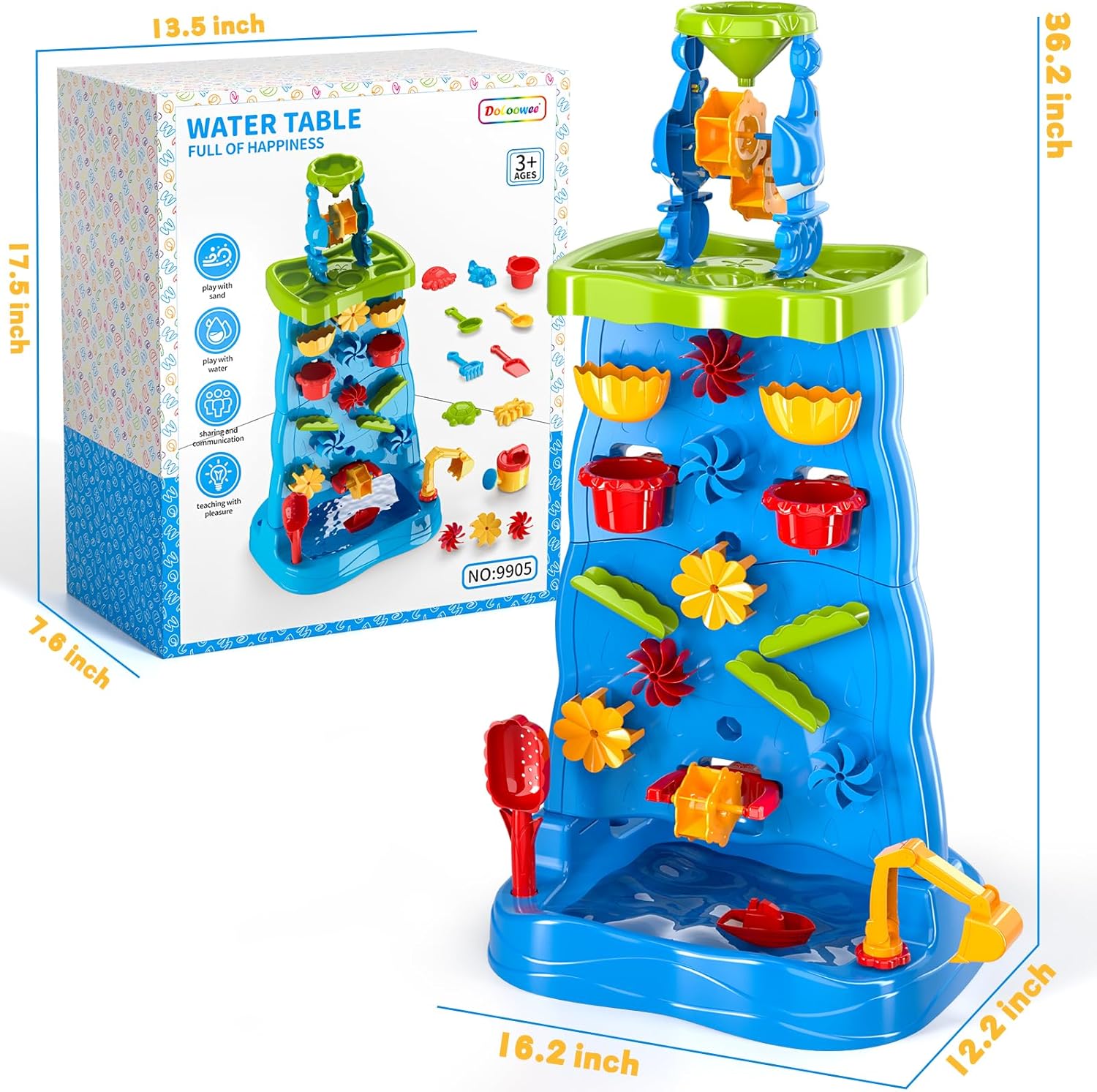 32 Pcs Beach Water Table Toys: The water fall toys is 36.2 *16.2* 12.2 inches. This beach toy set includes everything you need for hours of fun to play outdoor sand beach. Water table, water tower, spoon, watering pot, boat, bucket, chair and some sand beach toys like molds, sieve, shovel and rake etc. Taking water play to a new level of water fun