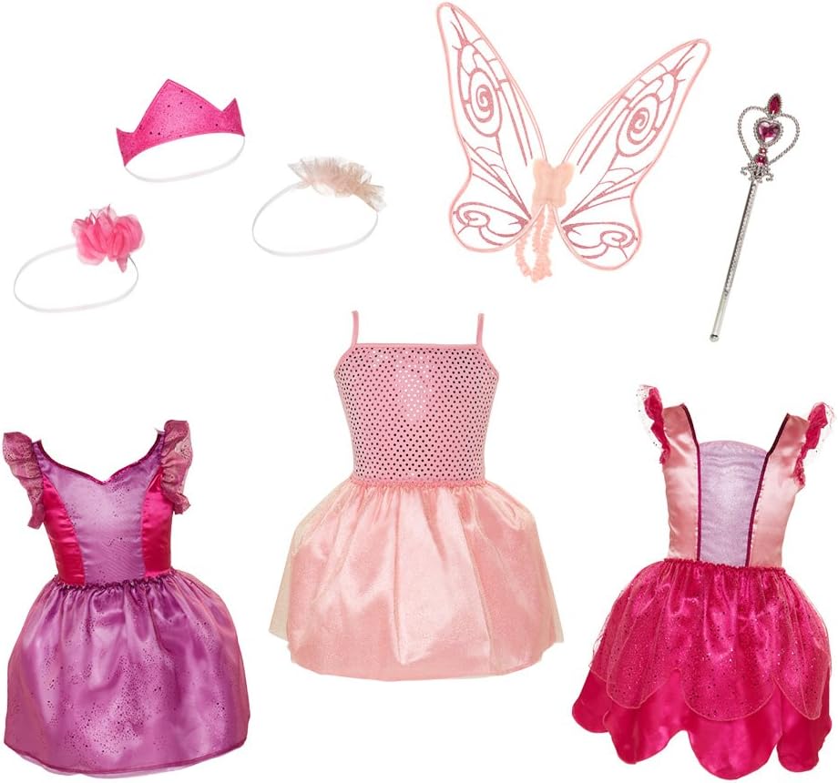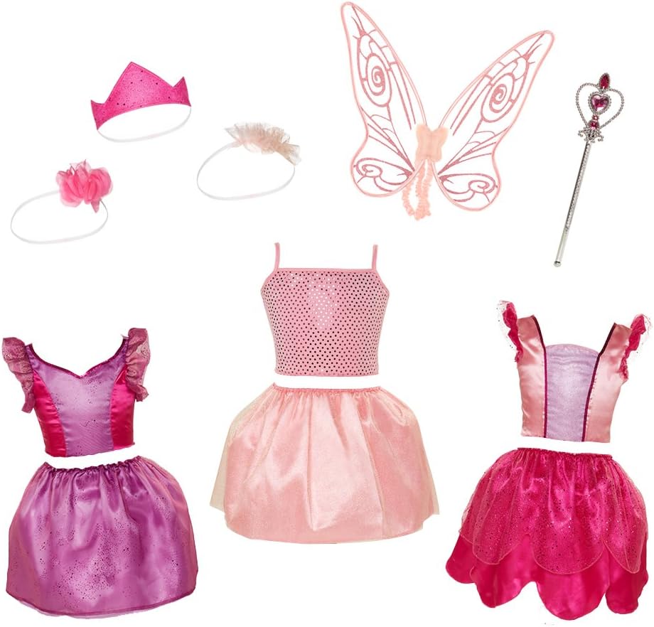 This adorable 11 piece Dress Up Set comes with 3 complete outfits with plenty of options for mixing and matching; Also included are 3 matching hair bands, a pair of fairy wings and a sparkly princess wand