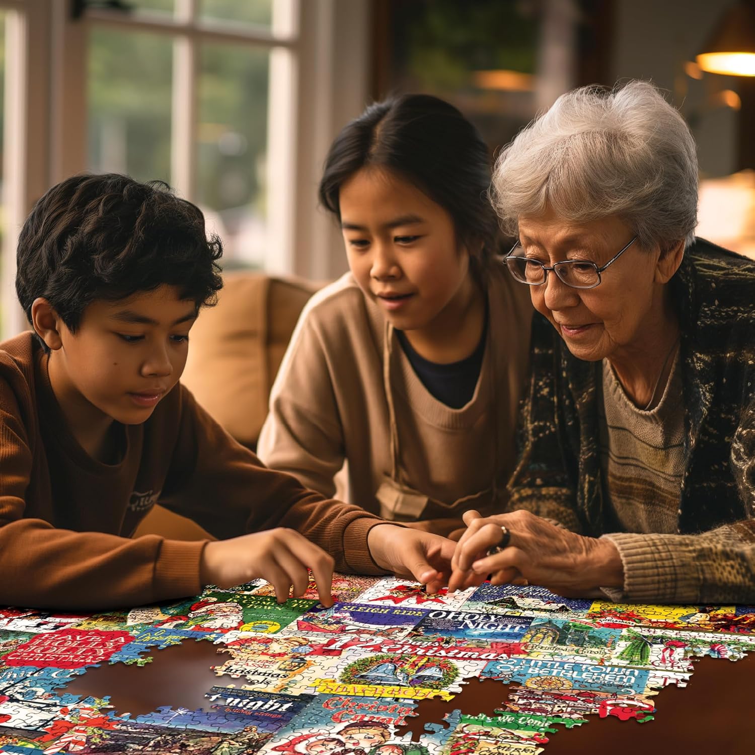 CHRISTMAS CAROLS: Hum along to your favorite Christmas carols while putting together this fun 1000 piece jigsaw puzzle that features a collage of your favorite songs!