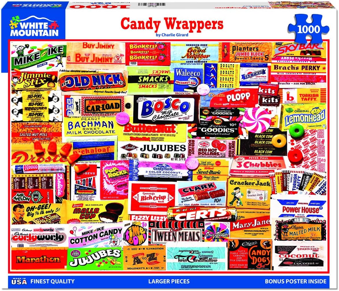 Take a sweet stroll down memory lane with our Candy Wrappers Jigsaw Puzzle. One of the best sellers at White Mountain Puzzles, the Candy Wrappers makes a great gift for both young and older candy lovers. Featuring a collage of timeless candy brands, this colorful jigsaw puzzle will bring something to the table for all ages. 1000 pieces of fun and entertainment everyone can enjoy! This exceptional piece is one of artist Charlie Girard’s finest contributions to our collection and a customer favorite. Charlie Girard, the creator of fantastic, fun, and unique collage puzzles, has become one of White Mountain Puzzles’ most popular puzzle designers ever with his seemingly endless supply of ideas and creativity. Art jigsaw puzzles are a fun and inexpensive way to enjoy beautiful works of art first hand! Jigsaw puzzles are also used to boost cognitive skills; develop hand-eye coordination, fine motor skills, problem solving, shape recognition, memory, and task completion. The White Mountain Puzzles – Candy Wrappers includes 1000 unique interlocking pieces made of sturdy blue chipboard on recycled paper. Extra large sized pieces for easy handling. Completed puzzle dimensions: 24 x 30 inches. Every White Mountain Puzzle is proudly manufactured in America with a 100% customer satisfaction guarantee.