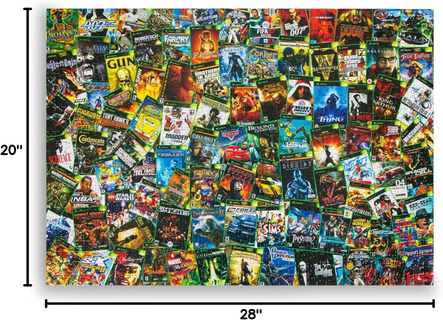 LEVEL-UP WITH THIS PUZZLING CHALLENGE There’s no cheat codes for beating this game! Enjoy a nostalgic throwback with this Xbox jigsaw puzzle. Inspired by the popular video game console, this 1,000-piece puzzle features a collage of classic Xbox games. Piece by piece, you will reveal a collection of box art from titles that dominated the and early and mid-2000s. The collages features sporty titles like FIFAand Madden, Disney favorites like The Incrediblesand Cars, classics like Marvel vs. Capcomand Mortal Kombat, and many more popular video games. THE PERFECT FIT FOR GAMERS Â Specially made from 100% recycled puzzle board material, the premium construction provides a top-quality building experience. The completed jigsaw puzzle measures 28 x 20 inches, making a great display piece with any gamer’s collection. Level-up with this entertaining Xbox jigsaw puzzle challenge.